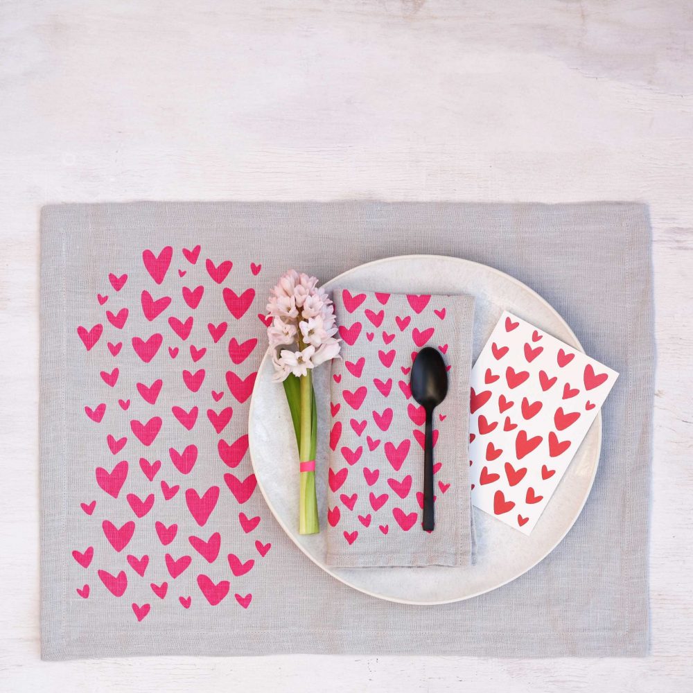 Startseite » Marken » Frohstoff Textilmanufaktur » Frohstoff Textilmanufaktur Tischset Leinen grau Herz neonpink