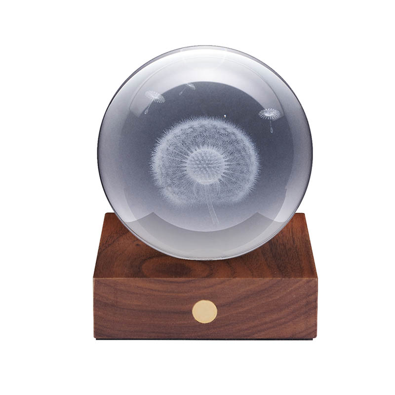 Akku Kugellicht mit 3D-Pusteblumen-Motiv auf Walnussholzbasis