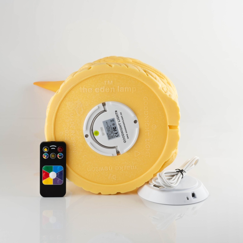Tauche ein in die Welt der Eden Saffron Gelb Lampe! Inspiriert vom allerersten Garten erstrahlt sie in leuchtendem Gelb und zeigt einen Tukan, der auf einem Felsen voller Hibiskusblüten, Monstera-Blättern und verbotenen Früchten ruht.