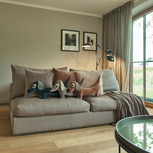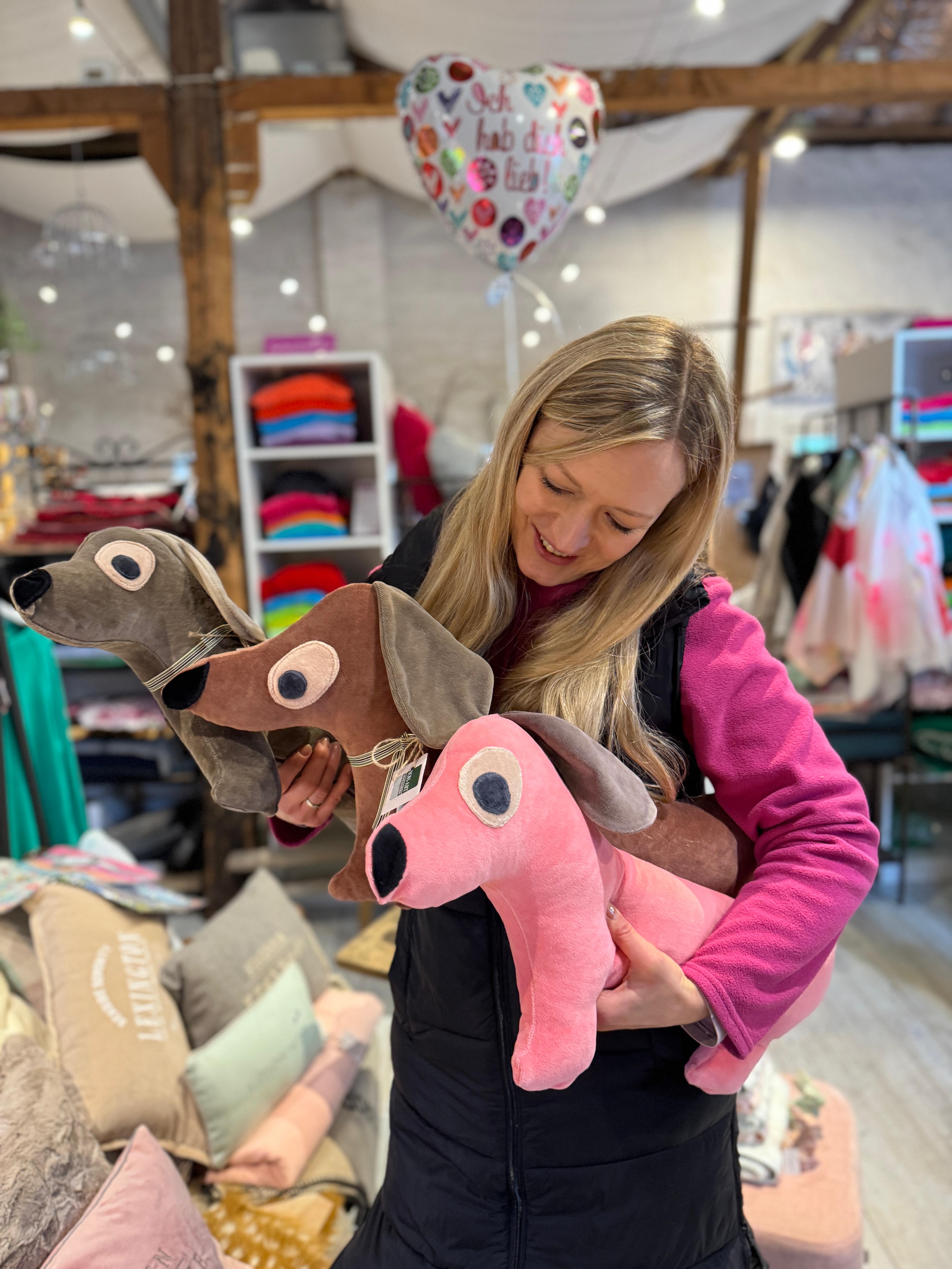Dein neuer bester Freund auf dem Sofa: Das farbenfreunde Nicky Dackel Kissen pink Peach