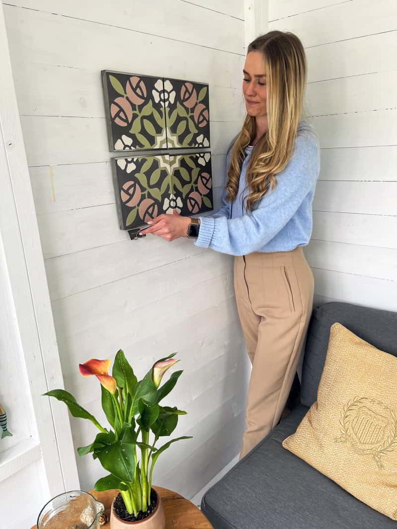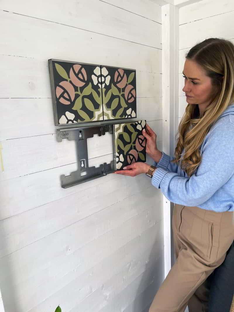Das Konzept besteht aus einer durchdachten Edelstahl Wandhalterung, die es Dir ermöglicht wunderschöne einzelne Fliesen seitlich einzuschieben und einfach zu wechseln.